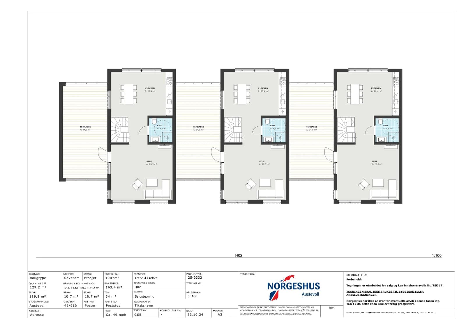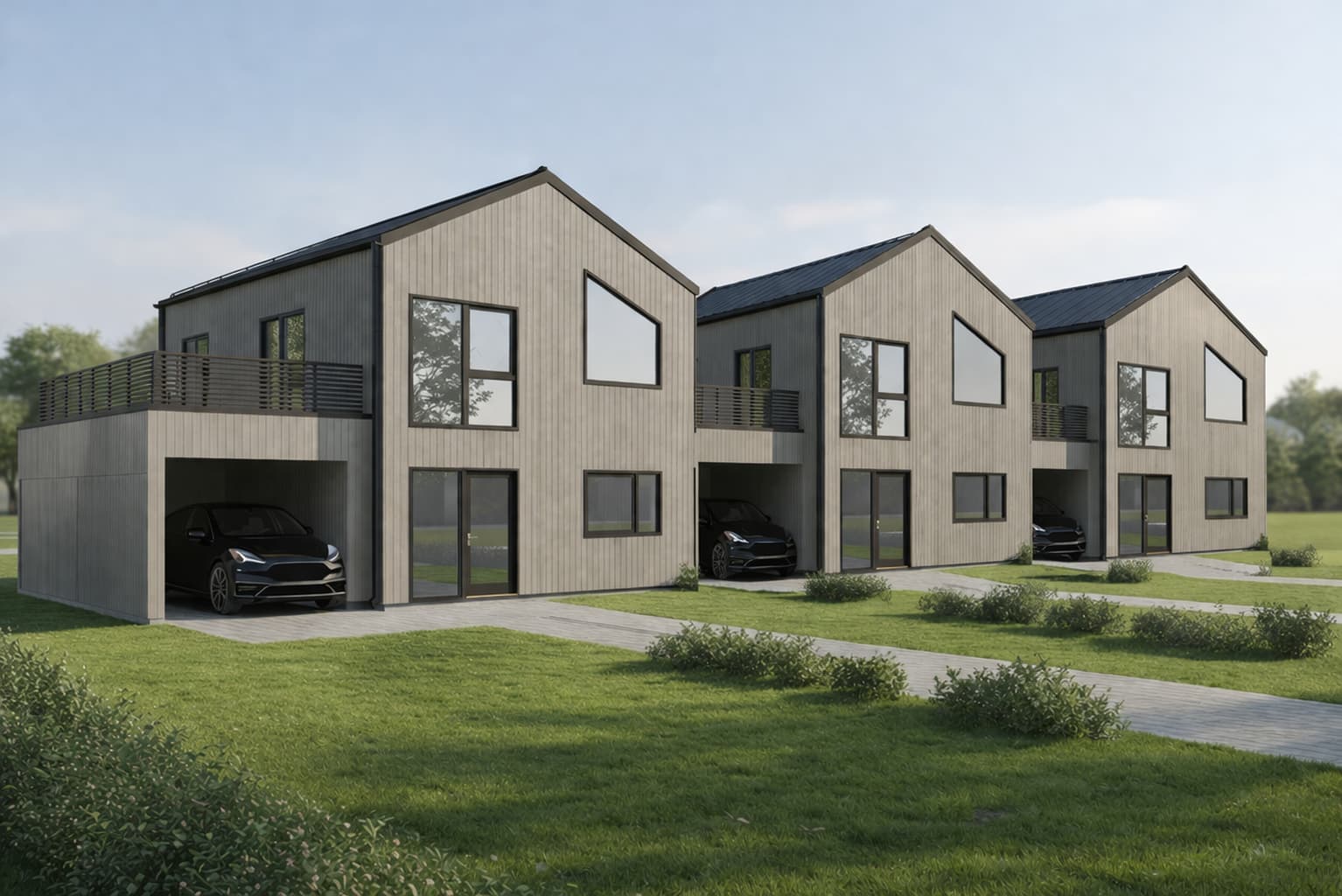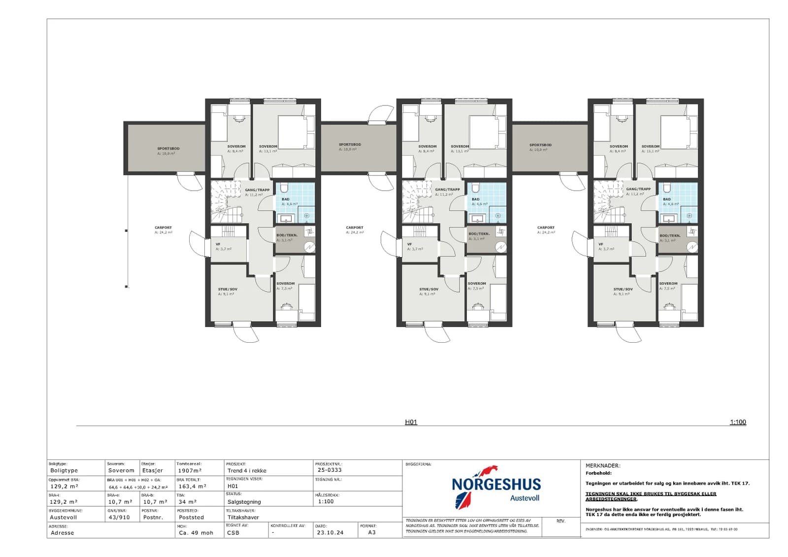 Prosjektet består av tre moderne kjedede eneboliger med gode planløsninger og høy bokvalitet. Boligene er koblet sammen via carport og sportsbod, noe som gir et privat preg og god avstand mellom enhetene, og med stor takterrasse over carport og bod.