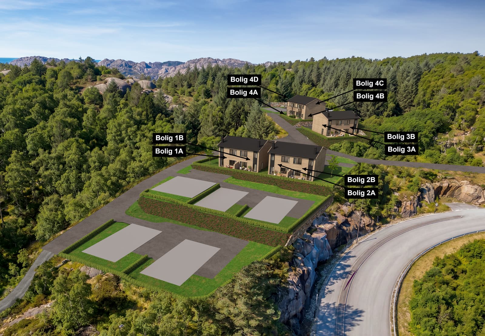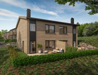 Moderne tomannsbolig over to etasjer, beliggende på felt BB32 (2 bygg = 4 boenheter). Lyse fasader i tre og direkte utgang fra stue/kjøkken til uteplass. Tomten fradeles, slik at hver boenhet får egen matrikkel, eget målebrev og egen adresse – ingen sameie mellom boenhetene.