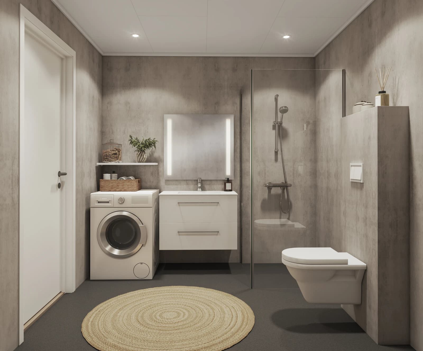- Moderne bad: 60 cm hvit baderomsinnredning, vegghengt toalett, 90x90 cm dusjhjørne, termostatstyrt dusjbatteri, varmekabler i gulv