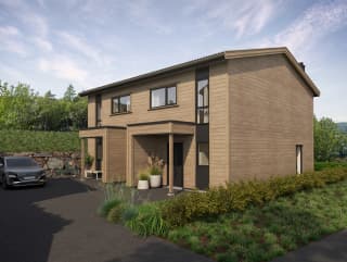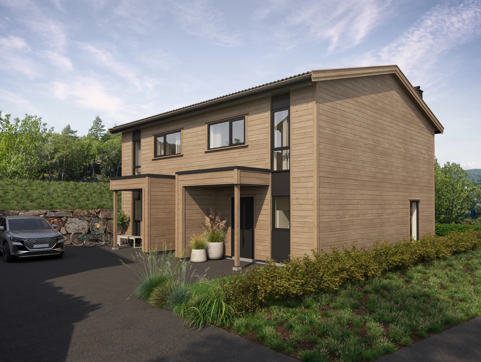 Romslig tomannsbolig over to etasjer, beliggende på felt BB30 (2 boenheter). Moderne uttrykk med trekledning og saltak. Tomten fradeles, slik at hver boenhet får egen matrikkel, eget målebrev og egen adresse – ingen sameie mellom boenhetene.